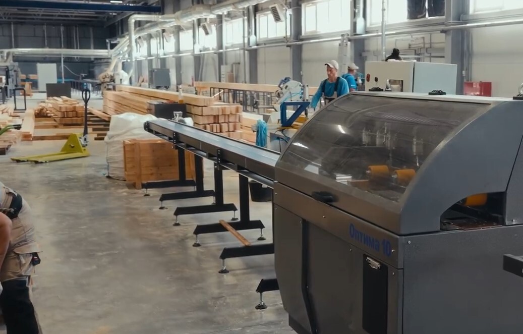 Гладкостроганный клееный брус отправляется на автоматизированный деревообрабатывающий немецкий центр Hundegger K2, где производится зарезка деталей по проекту.